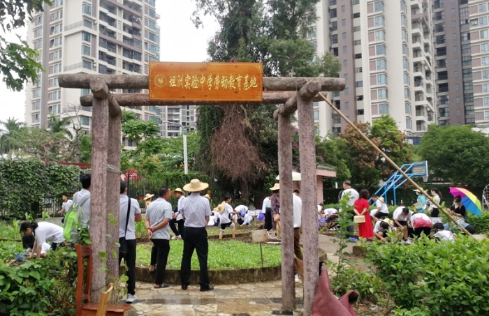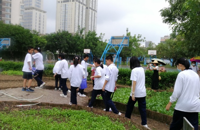 坦洲實驗中學的古娜芬老師帶來了一節(jié)精彩的《菜苗的移栽》公開課。她先帶領學生們上了10分鐘的理論課,了解菜苗移栽的操作方法和注意事項,然后讓學生們以9人為一組自由組隊,領取勞動工具,進行勞動分工。學生們興高采烈地帶著工具到學校的勞動教育基地進行種菜勞動。他們有的起苗,有的挖窩,有的種菜,有的澆水,干的不亦樂乎。