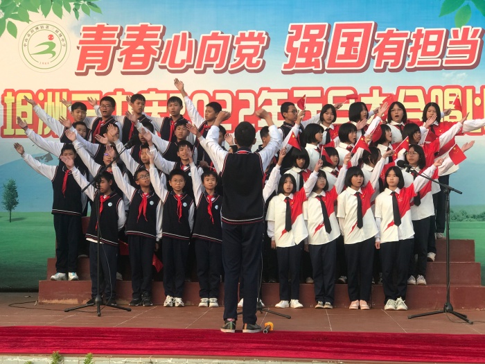 當日歷翻開新的一頁,小樹又要增加一個年輪,我們歡聚一堂,唱響青春。二2班以一首《團結(jié)就是力量》拉開大合唱帷幕,雄厚有力、整齊劃一的聲音傳遞著中華兒女勠力同心,共克時艱的決心與信心。愛國,是一種堅定的民族精神,是一種振興中華的責任感。二1班通過一首《我的中國心》向全體師生表達了一種強大的精神力量,不畏艱難險阻,創(chuàng)造屬于我們祖國的輝煌成就。未來屬于青年,希望寄予青年。一3班通過一首《少年中國說》述說著青年的夢想,青年的努力以及青年對未來的憧憬、期望,說唱結(jié)合,展現(xiàn)青年的活力與朝氣。黃河孕育偉大的中華文明,三2班以一首《保衛(wèi)黃河》唱出對黃河的禮贊,歌曲聲音洪亮,氣勢恢弘,鋼琴伴奏,增添了獨特的味道。每個周一,國歌想起,五星紅旗冉冉升起,三3班通過男女輪唱、齊唱等方式演奏《紅旗飄飄》,唱出“此生無悔入華夏”的驕傲與自豪。2021年,我們迎來建黨100周年,100年來,我們祖國發(fā)生翻天覆地的變化,三1班通過深情演繹一首《我愛你中國》表達了對祖國母親無限的感激之情。中華少年,風華正茂,少年的夢就是中國夢,一2班通過一首《少年強》將大合唱推向高潮,慷慨激昂的曲調(diào),讓我們相信少年的未來就是中國的未來。沒有中國共產(chǎn)黨,就沒有現(xiàn)代化的中國,一1班廖文輝、李家欣以一段精彩的演講引入一首《沒有共產(chǎn)黨就沒有新中國》,科技創(chuàng)造未來,伴隨著一面黨旗從空中飛過,一1班放聲歌唱,深情傾訴對中國共產(chǎn)黨的驕傲與自豪。初心不忘青春志、匠心共筑中國夢,教師代表卞堪佐、吳境聰、黎小玲、劉秀平、肖偉芳領唱,全校師生共同演繹《不忘初心》,嘹亮的歌聲將此次大合唱落下帷幕。