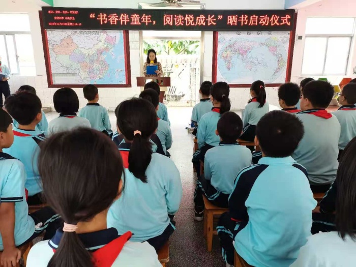 首先進行的是曬書啟動儀式。由教師代表肖穎老師發(fā)出“捐兩本,讀百本”曬書活動倡議;學生代表六(1)班的古圣堡同學向同學們介紹多讀書的益處;馬校長在致辭中提出一個希望:希望從現(xiàn)在開始,同學們能全身心地投入到讀書活動中,讓知識伴隨同學們走好人生的每一步。該校一直以來,十分注重培養(yǎng)學生的閱讀習慣,過去一學年,學校為各圖書角增添一萬多元的圖書,還增設了一個 “隊長書吧”,讓同學們在放學等候父母接送的時候,自主閱讀。