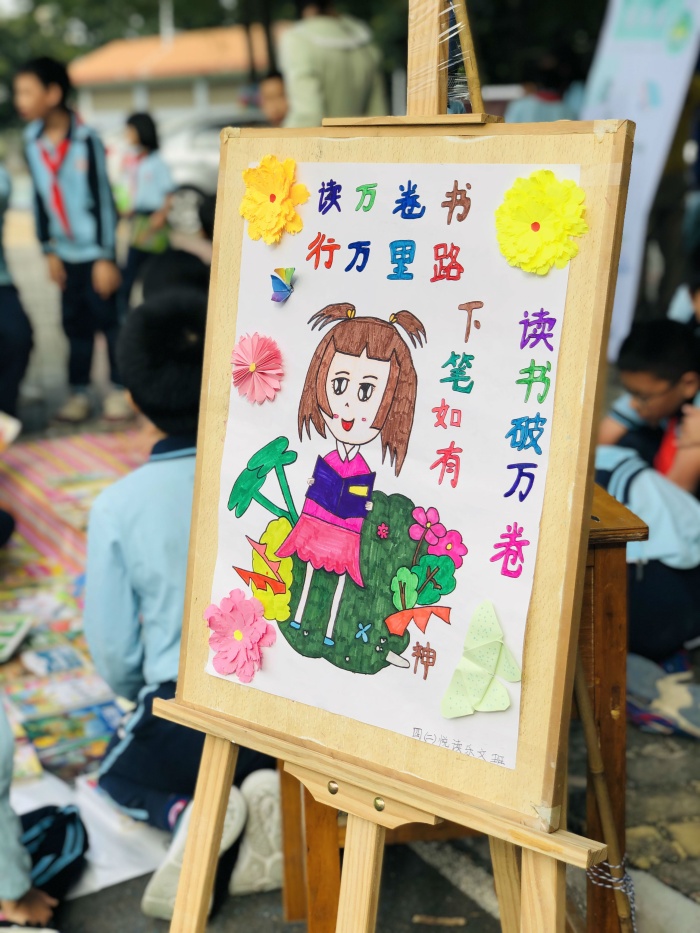 啟動儀式結束后,曬書活動正式開啟,全體師生以及班級家委的一齊參與讓整個校園沸騰起來。全校14個班級可謂八仙過海各顯神通,無論是曬書攤位的布置還是同學們以書換書的創(chuàng)意,都讓人大開眼界:三(3)班的 “瓶水齋”奪人眼球;四(1)班的 “淘書樂”精美別致,讓人耳目一新;四(3)班“會移動”的海報,真讓人拍手叫絕;五年級同學制作的各類精美海報,讓人嘖嘖贊嘆……還有各種換書抽獎,換書贈書簽等植入的小活動,把曬書活動推向了高潮,整個校園洋溢著歡聲笑語。一個小時的曬書活動接近尾聲,喧囂過后,整個校園又是一幅別樣的寧靜:換得心愛之書的孩子們不約而同,在校園的各個角落,席地而坐,手捧書籍,靜靜閱讀,閱讀的美好在這里悄然而生。