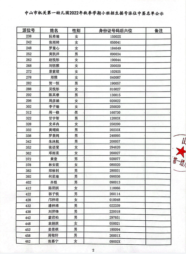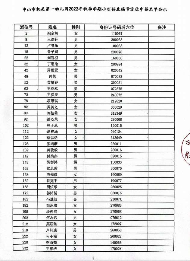 中山市機關第一幼兒園2022年秋季學期小班招生搖號派位中簽名單公示
