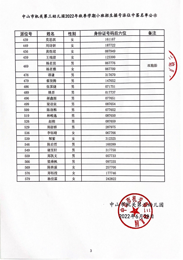 中山市機關第三幼兒園2022年秋季學期小班招生搖號派位中簽名單公示