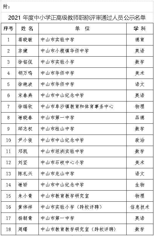 附:2021年度中山市中小學(xué)正高級教師職稱評審?fù)ㄟ^人員名單
