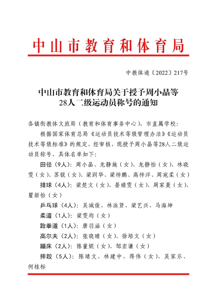 中山市教育和體育局關(guān)于授予周小晶等28人二級運動員稱號的通知