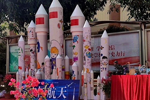 開幕式現(xiàn)場(chǎng),豐華學(xué)校還展示了由信息科技組自行制作的一組大型火箭模型。在宣傳我國(guó)航天科技相關(guān)成就的同時(shí),還配合了聲、光、電與煙霧噴射的特效,定時(shí)模擬火箭發(fā)射。知識(shí)面廣,趣味性強(qiáng),科技感十足,這樣的展示活動(dòng)既豐富了學(xué)生的知識(shí),又增強(qiáng)了學(xué)生的科學(xué)觀和強(qiáng)國(guó)觀。