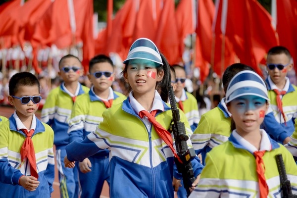 紅旗擁簇處,同學(xué)們護(hù)著國(guó)旗,托起巨幅黨旗、團(tuán)旗和隊(duì)旗,踏著整齊的步伐,呼喊著“請(qǐng)黨放心,強(qiáng)國(guó)有我”的口號(hào),意氣風(fēng)發(fā)地通過觀禮臺(tái)。宏大的場(chǎng)面,激烈的節(jié)奏,震撼著現(xiàn)場(chǎng)的每一位觀眾,觀禮臺(tái)上響起了陣陣?yán)坐Q般的掌聲。