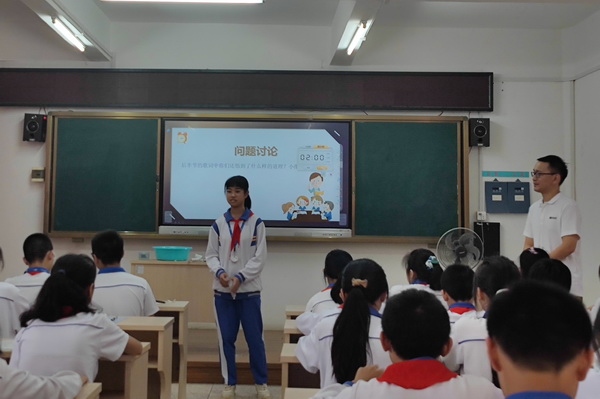 下午,小欖一中黃鐘輝老師給楓洋中學701班帶來一節(jié)《珍惜時間》主題班會課。黃老師先用一個游戲《聰明站》,以消除學生的緊張感,再以一首粵語歌曲《陀飛輪》作切入點,引導學生品味歌詞,感悟人生,明白時間的珍貴,學會合理安排管理時間。