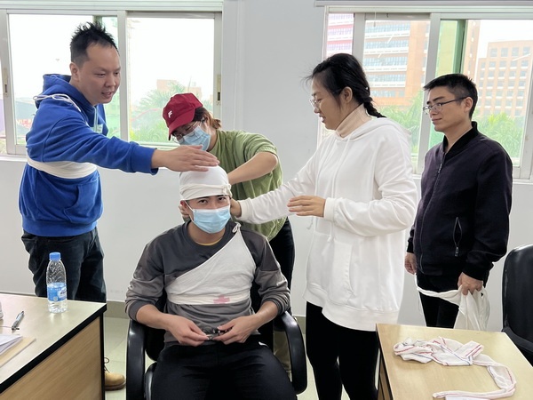 下午,學(xué)習(xí)的主要內(nèi)容是氣道異物梗阻急救法和受傷包扎。紅十字會志愿者講師對氣道異物梗阻搶救和如何對傷者進(jìn)行包扎的內(nèi)容作了詳細(xì)講解;然后,指導(dǎo)大家開展實操活動。“理論+體驗”的模式,讓參訓(xùn)隊員進(jìn)一步鞏固所學(xué)知識,掌握實用急救知識和技能。隊員們認(rèn)真練習(xí)、積極體驗,在之后進(jìn)行的20道題考試中,都順利過關(guān)。經(jīng)過理論測驗和實操考核,小欖一中的救護(hù)隊員們正式成為紅十字救護(hù)員。