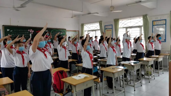 疫情防控之下, “復(fù)學(xué)第一課” 活動(dòng)主題采取了釘釘直播的模式,由莫秀紅副校長主持。升旗儀式上,當(dāng)國歌緩緩響起,同學(xué)們整齊地佩戴著紅領(lǐng)巾,莊嚴(yán)佇立,注視著屏幕上冉冉升起的國旗。