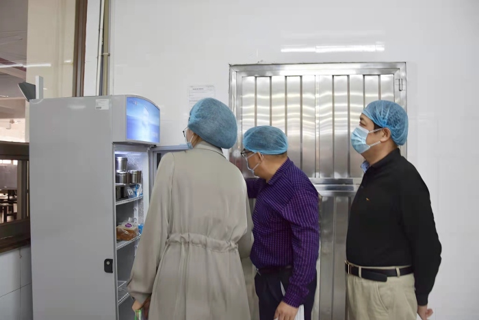 實(shí)地檢查食堂疫情防控工作。中山一中鐵城中學(xué)歐大新副校長詳細(xì)匯報(bào)了鐵城中學(xué)食堂的疫情防控舉措,鐵城中學(xué)一直嚴(yán)格把好食品采購關(guān),把好食品衛(wèi)生關(guān),全力確保師生食品安全和營養(yǎng),讓師生滿意、家長放心。