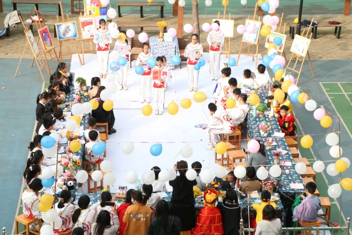 葛老師策劃的是一場課本劇表演,從道具的準(zhǔn)備到腳本的撰寫,從排練到上場表演,她親歷了與孩子共同成長的每一寸時光。給力的家長團(tuán),將音響設(shè)備搬來現(xiàn)場,地毯要與班服顏色協(xié)調(diào),氣球要隨風(fēng)飄起來,桌子要鋪上漂亮的桌布,好書要分享得恰到好處,現(xiàn)場布置要由孩子們完成。老師的智慧與孩子的成長,家長的參與與孩子的交流,都在一本本書的閱讀推進(jìn)中悄悄完成。(六8班語文老師葛陵帶領(lǐng)班級學(xué)生在鐵城小學(xué)厚德廊開展讀書會。)