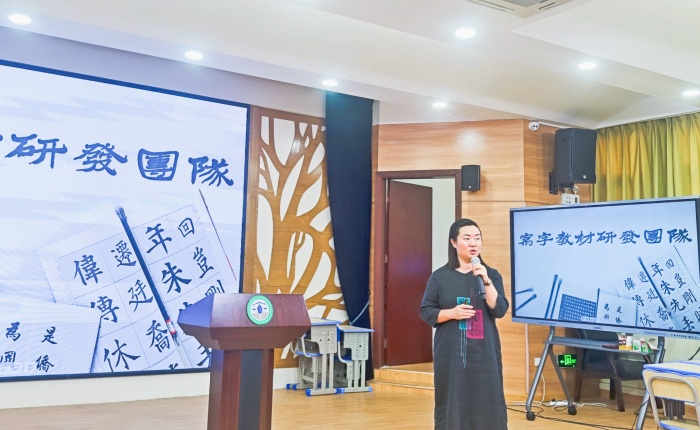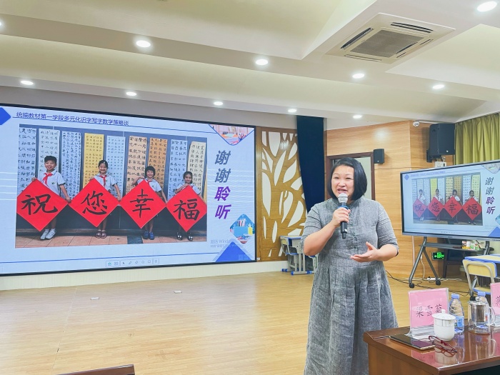 隨后,小欖教體文旅局蔣陽曄老師為在座全體老師做了寫字指導(dǎo)經(jīng)驗(yàn)介紹。蔣老師全面細(xì)致地介紹了小欖鎮(zhèn)這些年在寫字教學(xué)方面的具體做法與所取得的成績,并慷慨分享“寫字教學(xué)五步法”,讓在場的老師收獲滿滿。
