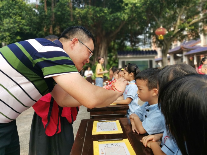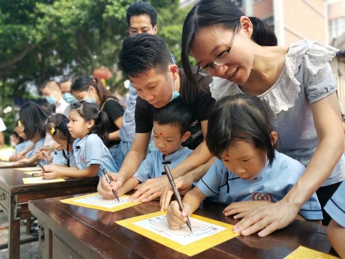 “開(kāi)筆禮”活動(dòng)在煙洲書(shū)院舉行,煙洲小學(xué)131名一年級(jí)新生及其家長(zhǎng)參加了此項(xiàng)盛典。孩子們懷著無(wú)限的憧憬和期待,在老師們和家長(zhǎng)們的引領(lǐng)下,在擁有147年歷史的煙洲書(shū)院中開(kāi)啟了人生的新篇章?!伴_(kāi)筆禮”在副校長(zhǎng)楊志堅(jiān)敲響的鐘聲中拉開(kāi)了帷幕,活潑可愛(ài)的孩子們認(rèn)真聆聽(tīng)了校長(zhǎng)黃文華的對(duì)他們的諄諄教誨,接著在悠揚(yáng)的傳統(tǒng)音樂(lè)聲中,老師們?yōu)槿w孩子“朱砂啟智”,寓意孩子們能夠開(kāi)啟智慧,從此耳聰目明、心靈手巧。然后就是家長(zhǎng)們認(rèn)真地教孩子們書(shū)寫(xiě)“人”字。以“人”開(kāi)筆,寓意著孩子從小就要認(rèn)識(shí)到學(xué)會(huì)做人的重要性,將來(lái)做一個(gè)頂天立地的人。“人”字寫(xiě)好后,孩子們由家長(zhǎng)領(lǐng)著緩緩走進(jìn)莊嚴(yán)神圣的煙洲書(shū)院參拜萬(wàn)世先師孔子。羅勇志老師帶領(lǐng)全體學(xué)生整理衣冠,誦《弟子規(guī)》(節(jié)選),三拜圣人孔子,三擊鼓明志,三位學(xué)生代表向老師敬茶,這些都寓意著學(xué)生們要尊師孝親、崇德立志、仁愛(ài)處世的中華傳統(tǒng)文化精髓,樹(shù)立“善 ” “正 ”行為規(guī)范,汲取尊師愛(ài)學(xué)的思想精華。最后,何彩云老師代表全體老師作了發(fā)言,表了決心。