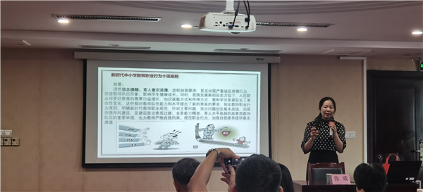 緊接著,張教授通過(guò)各種正面和反面實(shí)例為老師們辯證性地解讀了《新時(shí)代中小學(xué)教師職業(yè)行為十項(xiàng)準(zhǔn)則》。張教授強(qiáng)調(diào),老師們應(yīng)警惕外媒的伸手和黑手黨的侵入,時(shí)刻注意作為一名人民老師應(yīng)有的言行舉止,牢固底線意識(shí),防止思想滑坡,做一個(gè)師德師風(fēng)高尚的老師。
