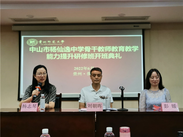 在研修班開班典禮上,國(guó)家級(jí)專業(yè)技術(shù)人員繼續(xù)教育貴州師范大學(xué)基地彭媛主任代表承辦方致辭,歡迎中山市楊仙逸中學(xué)的教師們前來研修交流學(xué)習(xí)。彭媛主任對(duì)貴州師范大學(xué)的教育教學(xué)資源和成果進(jìn)行了介紹,就本次培訓(xùn)的安排作了詳細(xì)的安排部署,并表示衷心希望研修班的學(xué)員不負(fù)千里之行,在今后教學(xué)中師逸功倍。