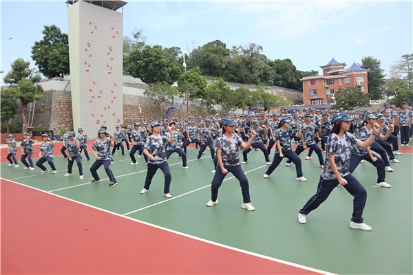 12個班級分成三組方隊進行會操表演,正步走,齊步走,排面整齊,口號響亮,擺臂、敬禮、跨立,每個動作剛勁威武,任汗水揮灑,任熱血澎湃,彰顯出磅礴的活力和堅定的意志。隨后的軍體拳表演中,沖、踢、擋、勾,揮一拳、打一式,一令一動,流暢自然,打得虎虎生風,方寸之間,7天磨煉的成果盡顯?!吨袊恕肥终Z操表演整齊劃一,氣勢如虹,表達了身為華夏子女的自豪和對祖國的赤子之心。
