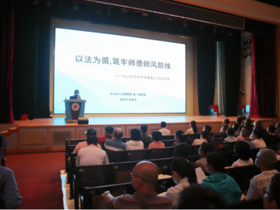 接著,我校邀請(qǐng)了中山市人民檢察院第一檢察部、未成年人檢察辦公室四級(jí)高級(jí)檢察官、中學(xué)法治副校長(zhǎng)及法治輔導(dǎo)員徐華玲檢察官為我校全體教職員作《以法為循,筑牢師德師風(fēng)防線》的主題講座。在講座上,徐檢察官?gòu)慕處熉殬I(yè)規(guī)范、師風(fēng)師德建設(shè)、依法執(zhí)教指引三方面對(duì)老師們進(jìn)行了普法教育。以案說法,用現(xiàn)實(shí)而具體的案例告誡老師們務(wù)必堅(jiān)守師德底線,以身作則,并且給老師們介紹了教師在教育教學(xué)過程中常見的法律風(fēng)險(xiǎn)及其如何應(yīng)對(duì)的指引。