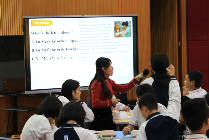 本次教研活動(dòng)的第一個(gè)環(huán)節(jié),由梁穎老師進(jìn)行示范課展示《跨教材教學(xué)擴(kuò)展閱讀》。首先從人教版七年級(jí)上冊(cè)英語(yǔ)Unit 9的閱讀篇章引入,通過(guò)讀前導(dǎo)入,快速閱讀,掃讀細(xì)節(jié)等教學(xué)環(huán)節(jié),引導(dǎo)學(xué)生理解課本篇章的體裁、主旨和細(xì)節(jié)。在帶領(lǐng)學(xué)生通讀常規(guī)教材篇章后,在第二部分的教學(xué)環(huán)節(jié),梁老師選擇了一篇與內(nèi)容相近的國(guó)外教材語(yǔ)篇,通過(guò)視頻導(dǎo)入,讓學(xué)生通過(guò)閱讀文本理清文章的寫作順序。學(xué)生通過(guò)口頭報(bào)告等教學(xué)活動(dòng)在合作與交流中對(duì)比國(guó)內(nèi)與國(guó)外的學(xué)校生活,認(rèn)知由感性逐步發(fā)展到理性,合理地構(gòu)建英語(yǔ)思維能力,使得學(xué)生通過(guò)獨(dú)立思考、小組合作等各種方法探索,獲得新知,從而激發(fā)了學(xué)生的學(xué)習(xí)興趣。