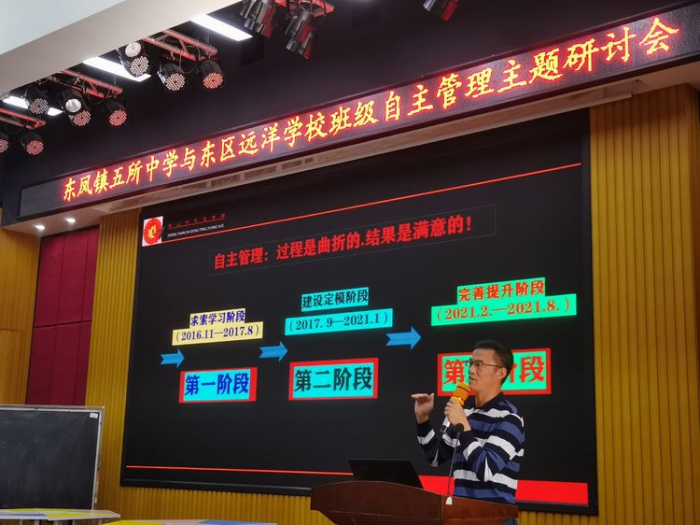 易理亮副校長通過“求索學(xué)習(xí)階段”“建設(shè)定模階段”“完善提升階段”三個階段,條理清晰地介紹東鳳中學(xué)學(xué)生自主管理模式實踐歷程。