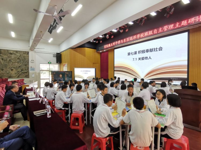 東鳳中學(xué)初二(15)班班主任葉惠連老師五步導(dǎo)學(xué)策略課堂教學(xué)研討課展示。葉老師一堂以“關(guān)愛他人”為課題的道法課堂,展示了學(xué)生的小組管理模式是如何在課堂教學(xué)中體現(xiàn)的。