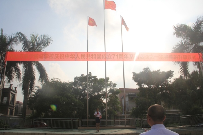 為慶祝中華人民共和國成立71周年,弘揚愛國主義精神,激發(fā)師生愛國情感、報國之志,中山市阜沙鵬誠學校于2020年9月30日上午,舉行了慶祝中華人民共和國成立71周年系列活動之一次特殊的升旗儀式。