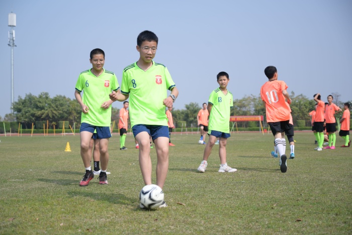 足球場上,李遠(yuǎn)雄、馬慶兩位教練親自上陣為前來觀摩學(xué)習(xí)的港中學(xué)子展示踩踏球、盤斷、傳球、射門、鐘擺等各種足球技能,贏得現(xiàn)場陣陣歡呼喝彩。34名港口中學(xué)足球隊(duì)隊(duì)員和一個(gè)班的學(xué)生,在兩位教練的指導(dǎo)下開展快樂足球課。寬敞整潔的綠茵場上回蕩著兩位教練的諄諄教導(dǎo),追風(fēng)少年,揮灑汗水,彰顯對(duì)足球的熱愛。
