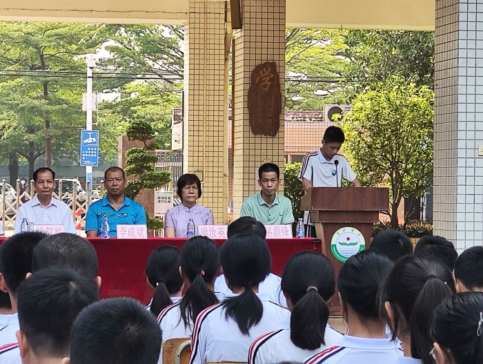 開學(xué)典禮上,港口中學(xué)校長秦聲通作了題為《傳承文脈,勇爭第一》的新學(xué)期致辭。他先向全體師生介紹了廣東省文聯(lián)主席、茅盾文學(xué)獎獲得者,同時也是我們學(xué)校校名、校訓(xùn)的題詞人——劉斯奮先生名字的寓意,啟發(fā)同學(xué)們要從這里開始奮斗,從現(xiàn)在開始奮斗,從每時每刻開始奮斗。新學(xué)期伊始,秦校長寄語同學(xué)們:應(yīng)以“廣東第一人”劉斯奮先生為榜樣,敢爭第一,勇爭第一,抓住每時每刻,抓住每個機會,鞭策自己,不斷奮斗,努力去實現(xiàn)自己的目標(biāo),牢記初心使命,在新的征程上闊步向前。