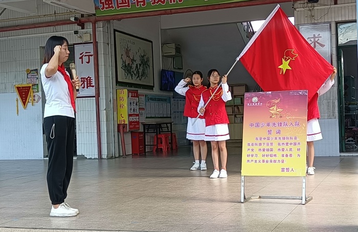 當(dāng)鮮艷的紅領(lǐng)巾在胸前迎風(fēng)飄揚(yáng)時(shí),少先隊(duì)員們倍感自豪。面對(duì)著入隊(duì)誓詞,少先隊(duì)員們?cè)诖箨?duì)輔導(dǎo)員吳曉燕地帶領(lǐng)下莊嚴(yán)宣誓。洪亮的呼號(hào)聲傳遞出小隊(duì)員們激動(dòng)、自豪的心情。緊接著,德育主任陳金祥為各中隊(duì)授旗;隨后,德育校長(zhǎng)鄧韶洲宣布新成立中隊(duì)及頒發(fā)中隊(duì)聘書。