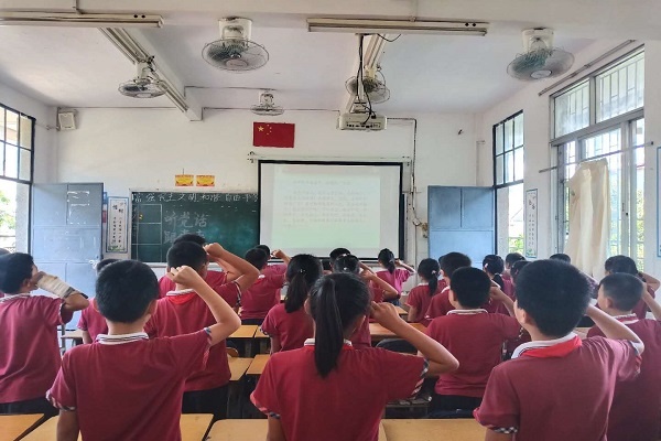 最后,各班孩子都舉起右拳宣誓,大聲喊出誓詞“我是中國(guó)人,我是炎黃子孫,龍的傳人,我愛(ài)偉大的祖國(guó)!我愛(ài)偉大,光榮,正確的中國(guó)共產(chǎn)黨!我愛(ài)勤勞智慧的人民,我愛(ài)我的家鄉(xiāng),我愛(ài)我的學(xué)校!牢記歷史,振興中華,好好學(xué)習(xí),天天向上。做有理想,有道德,有文化,有紀(jì)律,合格加特長(zhǎng)的革命事業(yè)接班人?!蓖ㄟ^(guò)鏗鏘有力的吶喊,相信孩子們?cè)诮窈蟮膶W(xué)習(xí)生活中,努力進(jìn)取,長(zhǎng)大后成為社會(huì)主義的接班人。