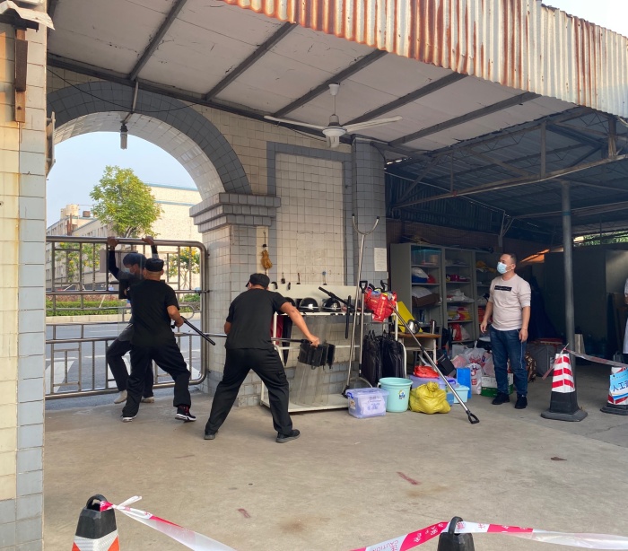 一名由教師扮演的“暴恐分子”企圖騙過(guò)門衛(wèi)進(jìn)入校園,被值班保安識(shí)破,馬上將其阻止在校門外。隨后,“暴恐分子”翻過(guò)欄桿,伺機(jī)沖進(jìn)校園,兩名門衛(wèi)保安立即向前阻止,立即啟動(dòng)學(xué)校防恐防暴應(yīng)急預(yù)案,當(dāng)值保安與“暴恐分子”周旋、搏斗,最終成功將“暴恐分子”制服,交由及時(shí)趕到的派出所警員進(jìn)行處置。