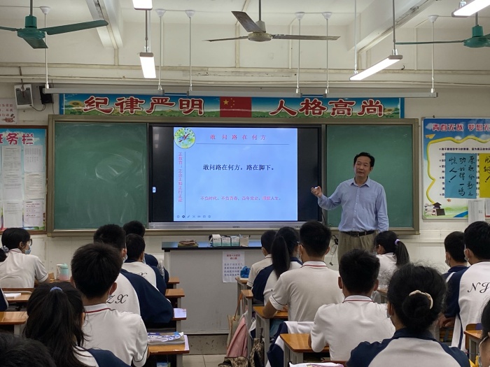 何杰華同志開講的思政第一課題為《敢問(wèn)路在何方》,貼近當(dāng)下初三級(jí)學(xué)生面臨中考學(xué)習(xí)壓力的現(xiàn)實(shí)。課上,何杰華同志以中國(guó)古典四大名著之一的《西游記》作為導(dǎo)入,引發(fā)學(xué)生集體共鳴,在通往成功的路上,正如電視劇《西游記》主題曲《敢問(wèn)路在何方》說(shuō)的,必定會(huì)面對(duì)非常多的坎坷艱險(xiǎn)。