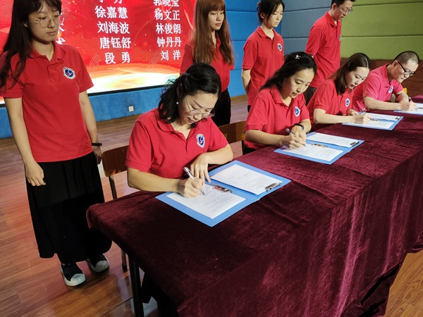 在主持人公布師徒結(jié)對的名單后,師徒們鄭重地在協(xié)議書上簽下了自己的名字。提筆之間,徒弟簽下的是承諾和決心,師父簽下的是使命和期盼,一份份承諾書承載了師徒攜手共進(jìn)的滿滿期盼。劉訓(xùn)強校長為師父們頒發(fā)聘書,這一份份聘書承載著學(xué)?!熬凵吵伤钡南M?!