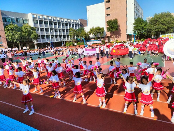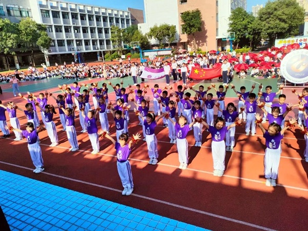 當(dāng)日清晨,英才學(xué)校運(yùn)動(dòng)場(chǎng)上,陽(yáng)光明媚,彩旗飄飄,孩子們身著各具特色的班服,佩戴各種裝飾,朝氣蓬勃,活力無(wú)限。8點(diǎn)整,開幕式準(zhǔn)時(shí)開始,激昂的運(yùn)動(dòng)員進(jìn)行曲響起,國(guó)旗隊(duì)、校旗隊(duì)、?;贞?duì)以及各班級(jí)方陣依次向主席臺(tái)走來(lái)。他們手持班旗班牌,擺臂有力,聲音洪亮,入場(chǎng)式表演更是異彩紛呈,各具特色?;盍?dòng)感的韻律操、氣勢(shì)恢宏的經(jīng)典詩(shī)篇吟誦《精忠報(bào)國(guó)》《滿江紅》、傳統(tǒng)武術(shù)五步拳和馬家槍、充滿童趣的手勢(shì)操《萬(wàn)疆》《少年中國(guó)說(shuō)》……各班或借助巨型標(biāo)語(yǔ)、橫幅,或手執(zhí)紅扇、手牽彩色氣球、手戴閃亮的手腕花等道具進(jìn)行展示,唱、跳、武、說(shuō)形式多樣,精神抖擻地展現(xiàn)著班級(jí)風(fēng)貌。各個(gè)班級(jí)別具匠心的入場(chǎng)式設(shè)計(jì)和整齊鏗鏘的隊(duì)列展示贏得了領(lǐng)導(dǎo)嘉賓和老師們的陣陣掌聲。