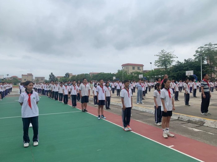 沙欄中學黨總支書記、校長、少工委主任梁炳華帶領(lǐng)全體少先隊員進行呼號:“準備著,為共產(chǎn)主義事業(yè)而奮斗!”“時刻準備著!”呼號結(jié)束,少先隊員們目送隊旗離場,隊旗的緩緩離場,標志著隊員們徹底告別童年時代,隊員們要滿懷希望,帶著勇氣和力量前行。