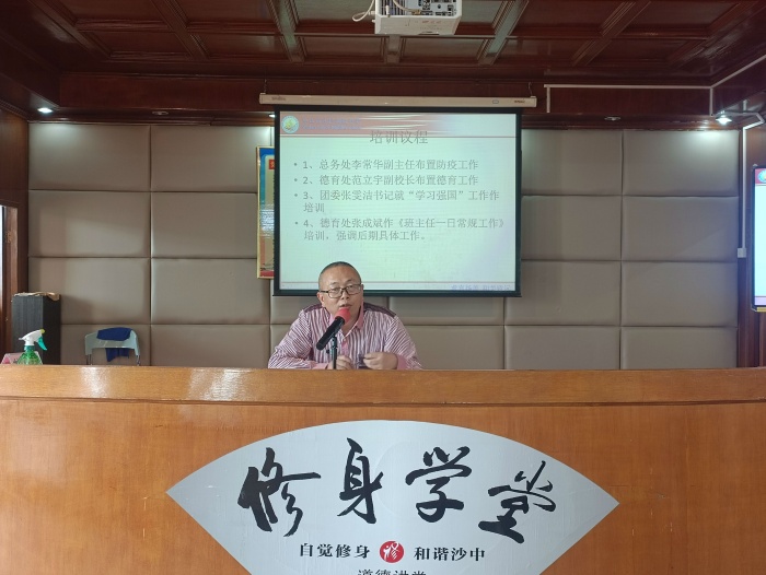 張成斌主任以《班主任一日常規(guī)工作》為題,對全體班主任進行培訓。張主任從“夯實常規(guī),心中有數(shù);嚴管厚愛,心中有度;培根鑄魂,心中有底”三方面對班主任的常規(guī)工作給予指導。比如課前、課間、午餐、午托、課后的時間點管理;班風學風的建設;班級文化的布置和營造。特別指出要嚴防學生涉黃、性侵、吸煙、沉迷游戲,同時向?qū)W生宣傳習近平新時代中國特色社會主義思想、社會主義核心價值觀和《家庭教育促進法》,強化愛國主義教育,幫助學生樹立正確的世界觀、價值觀和人生觀,幸福德育成就學生幸福人生的育人理念。