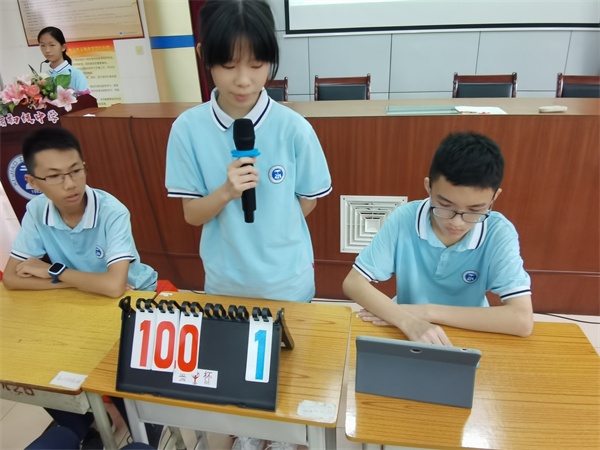 在學校德育處的部署下,主要由七年級學生參與本次比賽。賽前,梁惠嬌級長從選手選拔、培訓、觀眾的組織等各方面做了精細的安排;陳燕副主任對比賽的組織、題目的確定以及現(xiàn)場比賽的技術(shù)處理做了充分的準備。