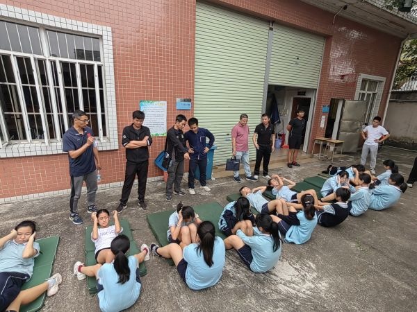 檢查組一行還察看了抽測場地,檢查了物資準備情況。當來到體育場,正好碰上初一級體育課,學(xué)生正在訓(xùn)練仰臥起坐,檢查組現(xiàn)場指導(dǎo)了學(xué)生動作要領(lǐng),指出容易犯錯的地方。