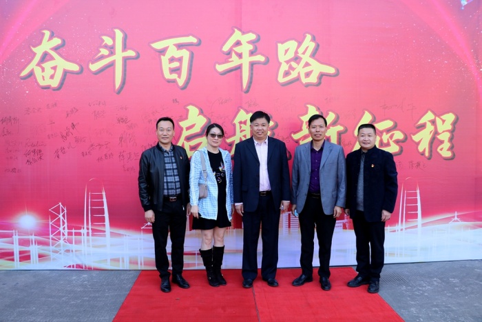 “奮斗百年路 啟航新征程”活動主題的巨幅牌樓矗立在教學樓前的廣場中心,一條寬大的紅地毯從牌樓下正中一直通向校門口,志愿者們分立兩旁,以最真誠的笑容歡迎嘉賓們的到來!嘉賓們踏著紅地毯滿面春風的進入會場,并在簽名欄上簽名留念。
