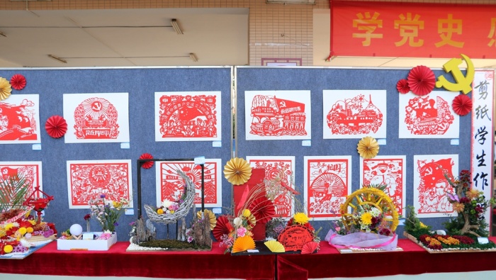 永寧中學教學樓一樓風雨長廊人頭攢動,川流不息。兩邊長長的展板分列正中央,展板內容主要反映永寧中學的“辦學理念”“教育教學成果”“黨史學習教育”“四史學習手抄報”等內容。展板前擺放著學生現(xiàn)場插花藝術作品,此次插花藝術以“百年圓夢,紅心向黨”為主題,展品造型別具匠心,鮮艷奪目。