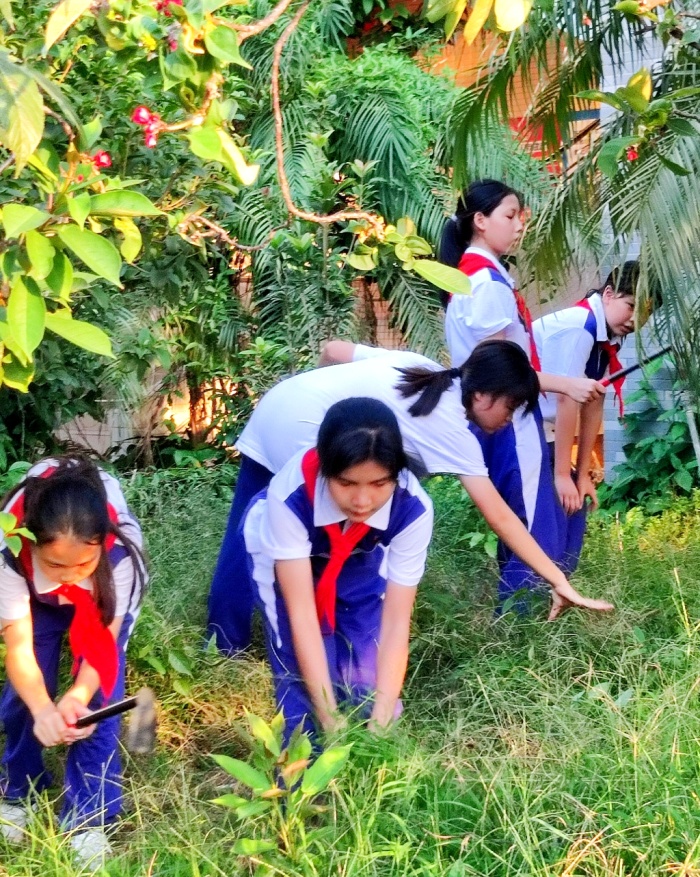 在校園的園藝基地,同樣熱鬧有序,同學(xué)們以班級(jí)為單位分小組分散開(kāi),在班主任和指導(dǎo)老師的指引下,撿落葉枯枝、除雜草、修剪花木。瞧!同學(xué)們撿落葉時(shí)的樣子多認(rèn)真,彎下身來(lái)仔細(xì)尋找,有的撿了滿滿的一筐,有的還撿到了許多的樹(shù)枝條,還有的發(fā)現(xiàn)了被遺落在角落的片片塑料袋......雖然雜草很多、垃圾很多,很臟很亂,但是每個(gè)同學(xué)都能仔細(xì)尋找到每個(gè)角落,他們不怕臟,不怕累,都積極地參與其中。修剪花木的同學(xué)更是像模像樣,手拿著大剪刀,商量、測(cè)準(zhǔn)、用力、清理,個(gè)個(gè)都像園藝師傅。雖然陽(yáng)光仍舊刺眼,但也阻止不了同學(xué)們的熱情,看到整潔的基地,干凈的園區(qū),同學(xué)們露出了開(kāi)心的笑容。