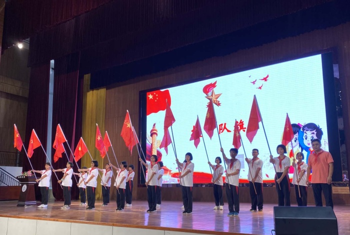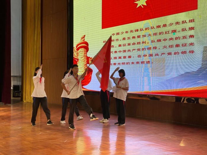 接著,該校團(tuán)委書記范斌斌為初一年級新建中隊授中隊旗;