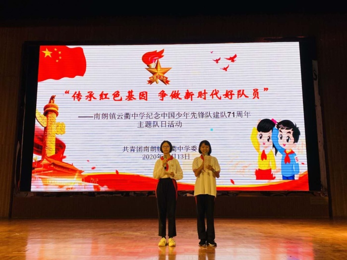 2020年10月13日下午,云衢中學(xué)在該校藝體中心順利舉行了“傳承紅色基因 爭做新時代好隊員”-慶祝中國少年先鋒隊建隊71周年主題隊日活動,云衢中學(xué)副校長曾建清、副校長劉毛古、主管初一年級的朱榅梅及周寶思主任、團(tuán)委書記范斌斌、團(tuán)委副書記及少先隊大隊輔導(dǎo)員楊勇等行政,云衢中學(xué)中隊輔導(dǎo)員和初一部分少先隊員參加了本次活動,此次活動由初一(8)班林楚琪和初一(13)班尹穎睿主持。