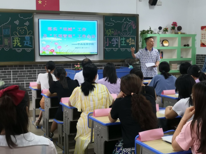 為推進中央“雙減”工作和教育部“五項管理”工作落到實處,促進學(xué)生全面發(fā)展、健康成長,2021年8月31日,中山市育英學(xué)校在一(3)班教室召開落實“雙減”及“五項管理”工作會議,會議由董湘鈞副校長主持,全體教師參加會議。