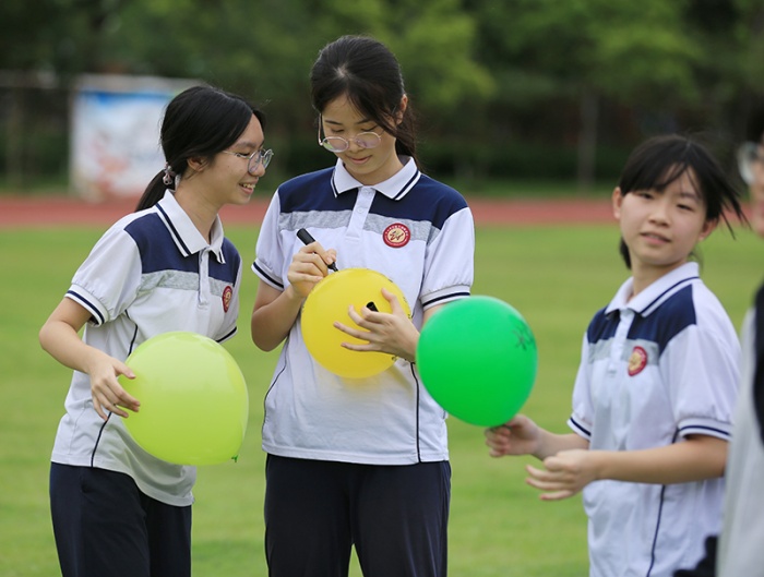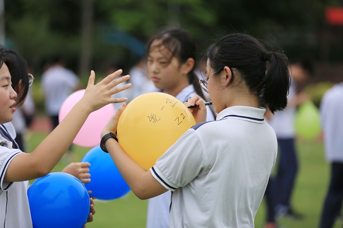 “中考沒(méi)什么大不了,我行!我一定行!”“沒(méi)關(guān)系,盡力就好?!薄芭Τ蔀楹隈R?!薄皦毫Υ蟊ā庇螒蛑?,同學(xué)們給氣球吹氣,然后在氣球上寫下自己的壓力或困惑,最后捏爆氣球,讓壓力伴隨著氣球一起炸開。同學(xué)們有的用腳踩,有的拿手捏,有的直接吹爆,還有的互相協(xié)作,通過(guò)擁抱擠爆氣球……