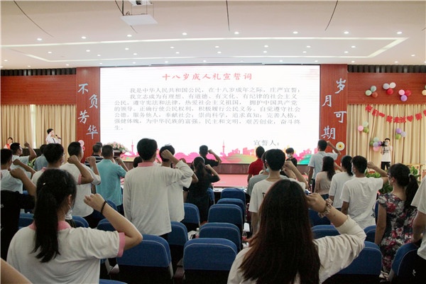 在18歲成人禮宣誓儀式上,17平面2班吳斌同學(xué)領(lǐng)誓,同學(xué)們面對國旗、莊嚴(yán)宣誓,立志要成為有理想、有道德、有文化、有紀(jì)律的社會主義公民,為中華民族的富強、民主和文明,艱苦創(chuàng)業(yè),奮斗終身!