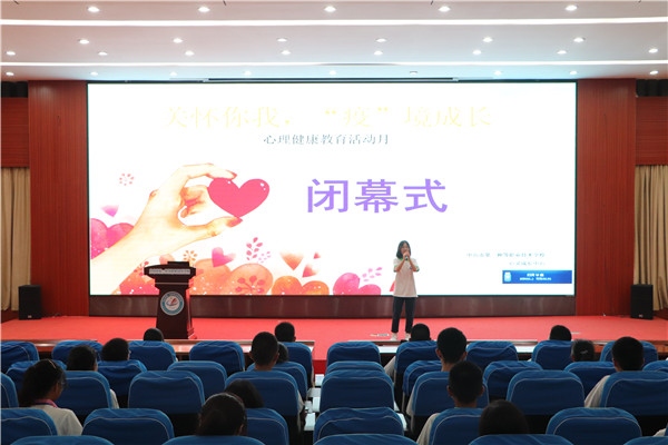 在閉幕式上,社工小魚姐姐為心理委員做“阿Q說”的暖場活動,隨著活動的進行,現(xiàn)場氛圍活躍起來。學校心靈成長中心聞明老師總結(jié)活動開展情況:本次心理健康教育活動月在學校、學部兩個層面進行,面對學生、家長、教師三個群體,共開展了32項活動;本次活動覆蓋面廣,參與度高,實效性強,實現(xiàn)了全員育人、全程育人、全方位育人;活動內(nèi)容多層次,內(nèi)涵豐富,如返校前教師心理教育培訓、心理健康教育活動月開幕式、復(fù)學適應(yīng)講座、音樂心理輔導工作坊、心理健康普查、心理教師家訪、云南生團體輔導、短視頻制作比賽、心理健康黑板報比賽、校園歌手大賽等活動。全校師生全員參與活動,體現(xiàn)出一職校學生陽光積極的生活態(tài)度。大會還對“微關(guān)懷,大成長”校園短視頻創(chuàng)作的主題特色心理健康教育活動中得獎的選手進行頒獎,鼓勵全校師生積極創(chuàng)作陽光正面的視頻,其中18數(shù)媒班何嘉杰的《夢》等13個作品榮獲一等獎,18食品1的 《少年》等19個作品榮獲二等獎,17燈具3班張楨的《以夢為馬,不負韶華》等35個作品榮獲三等獎,同時也現(xiàn)場展示了榮獲一等獎的作品,感受同齡人的創(chuàng)作激情和正能量?,F(xiàn)場還邀請到18分析的三位晉級歌手現(xiàn)場演唱,為即將到來的校園歌手大賽進行預(yù)熱。