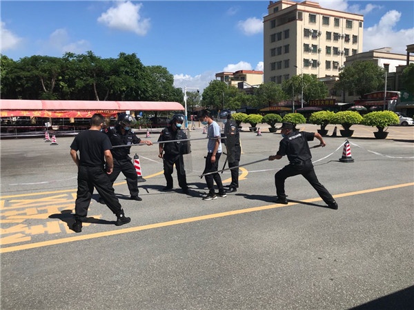 演練前,指導(dǎo)教官對整個演練流程進行了講解。演練開始,兩名“滋事者”手持器械,到校門口跟值班保安交涉,情緒激動,時不時揮動手中的器械向保安挑釁,想強行闖進學(xué)校。值班保安手持鋼叉、盾牌、警棍進行防備,進行勸退,同時馬上匯報保安隊長并調(diào)動各崗位人手到現(xiàn)場,并啟動一鍵報警按鈕和匯報學(xué)校值日行政。面對“滋事者”,保安員果斷出擊,大聲警告喊出:“不許動、放下器械”等口令,但“滋事者”還是強行硬闖,保安員手持鋼叉、盾牌等器械合力夾擊,很快就把“滋事者”制服,移交公安機關(guān)處理。整個應(yīng)急演練過程各環(huán)節(jié)處置有序展開,大家緊密配合,有條不紊。演練結(jié)束后,羅承志警官對演練細節(jié)進行了總結(jié)點評和專業(yè)技術(shù)指導(dǎo)。
