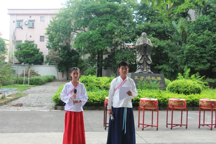 緊接著由六(2)班的學(xué)生帶來《弟子規(guī)》的誦讀表演。在他們的帶領(lǐng)下,全校學(xué)生集體誦讀《弟子規(guī)》,朗朗的讀書聲充盈了校園。然后是正衣冠儀式:自正衣冠,互正衣冠,師正衣冠?;顒?dòng)最后,全體師生向孔子像行鞠躬禮,少先隊(duì)員代表還在孔子像前為全體教師送上鮮花,向老師們送上節(jié)日最真摯的祝福。
