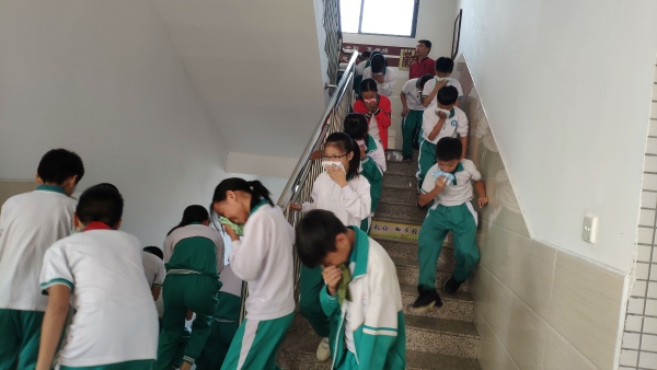 在消防應(yīng)急疏散演練前,各班班主任按學校制定的演練方案組織學生學習,并強調(diào)安全注意事項,預(yù)先排好班級隊伍,同時也安排了各樓班課室、走朗、樓梯口、樓梯拐彎處足人員,參加演練的工作人員,提前5分鐘就位,確保做好安全保護工作。當演練信號發(fā)出后,處在樓梯口的教師進行指揮,各班迅速在教室過道上整理好隊伍,按照預(yù)先排好的順序疏散,排成兩路縱隊,并彎腰捂嘴護頭有序前進。隨后各班主任把所帶學生送到安全地帶后應(yīng)立即清點人數(shù),并報告現(xiàn)指揮人員吳校長。消防安全疏散演練結(jié)束后,消防大隊人員進行了常見火災(zāi)滅火實戰(zhàn)演練,全體師生懂得了正確使用滅火器的方法,掌握了消防安全的相關(guān)知識,提高了抗擊火災(zāi)突發(fā)應(yīng)急事件的能力。