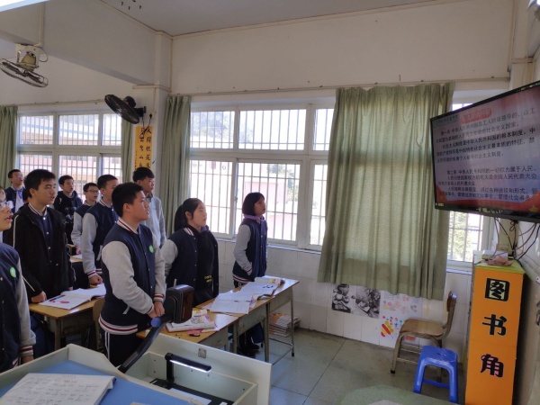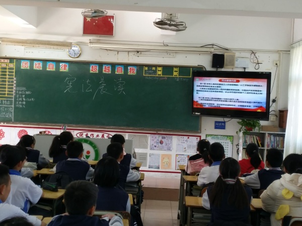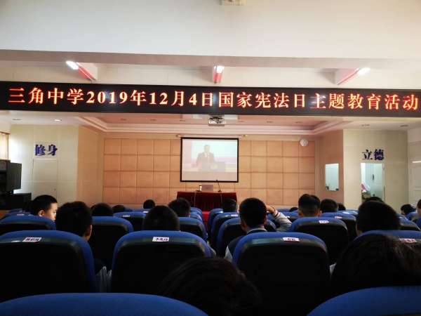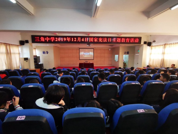 今天是第六個(gè)國家憲法日,也迎來了憲法宣傳周。為了開展憲法宣傳、弘揚(yáng)憲法精神、讓中學(xué)生學(xué)習(xí)憲法,提高法律意識(shí)。12月4日三角中學(xué)利用晨讀時(shí)間,全校各班在教室里由班長帶讀憲法(摘選),并抽調(diào)近300名學(xué)生在報(bào)告廳觀看直播,并進(jìn)行 “爭做守法中學(xué)生” 宣誓活動(dòng)。